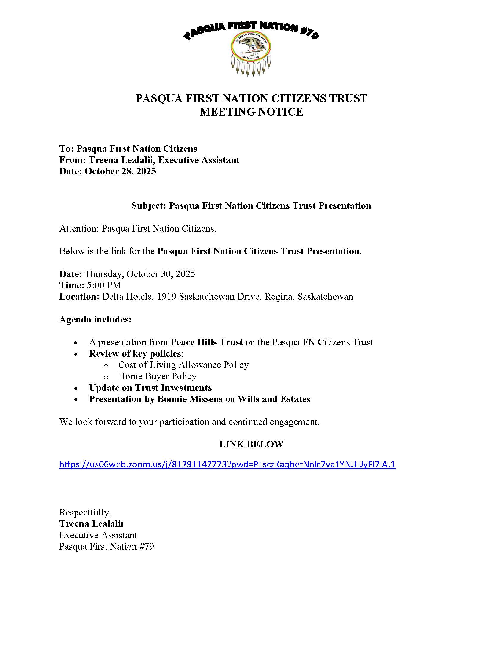 Subject: Pasqua First Nation Citizens Trust Presentation
