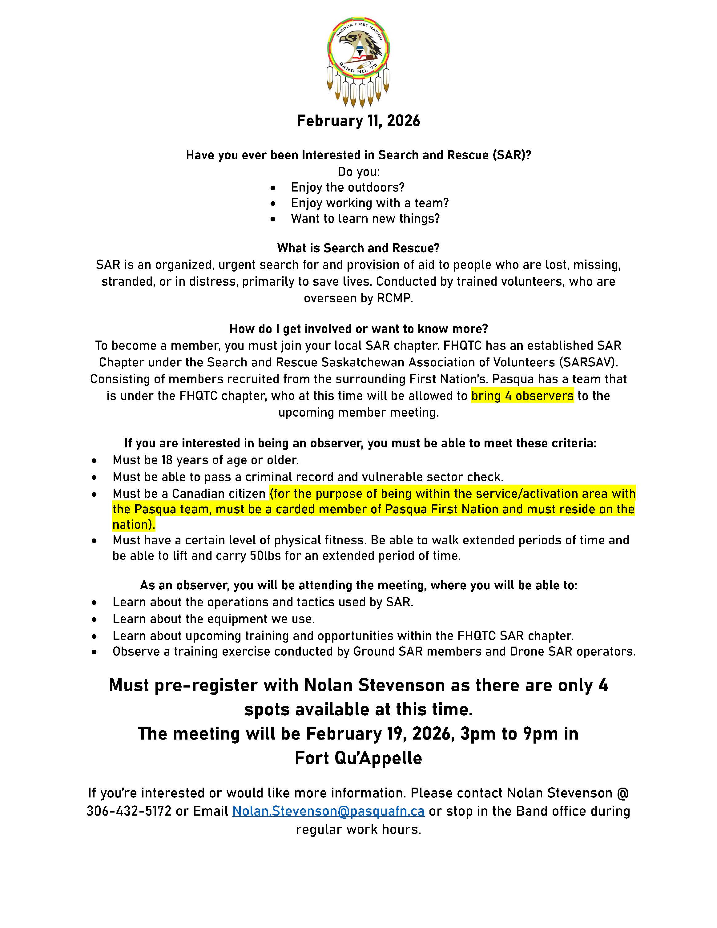 If you’re interested or would like more information. Please contact Nolan Stevenson @ 306-432-5172 or Email Nolan.StevensonREMOVE_THIS@pasquafnREMOVE_THIS.ca or stop in the Band office during regular work hours.